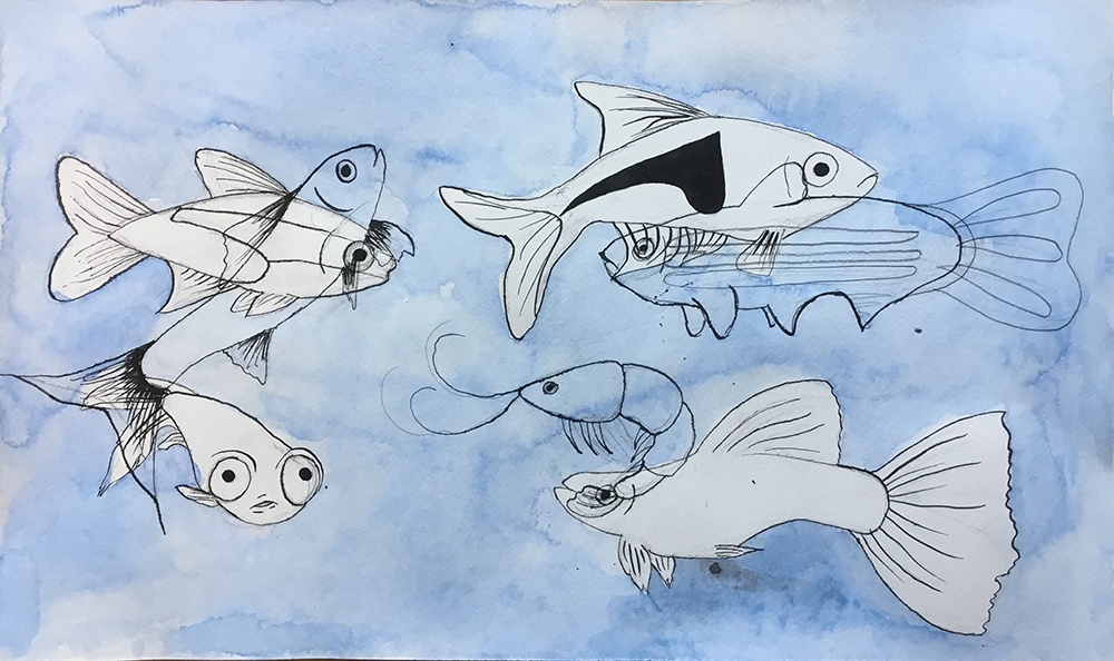 Eine Serie von Fisch-Studien unter Wasser, Fineliner auf Aquarell