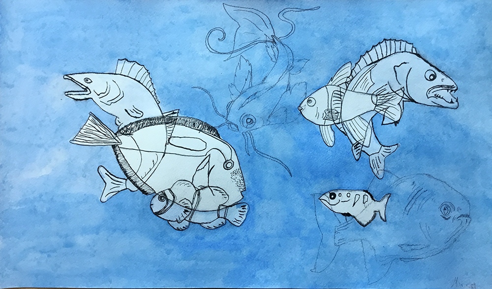 Eine Serie von Fisch-Studien unter Wasser, Fineliner auf Aquarell